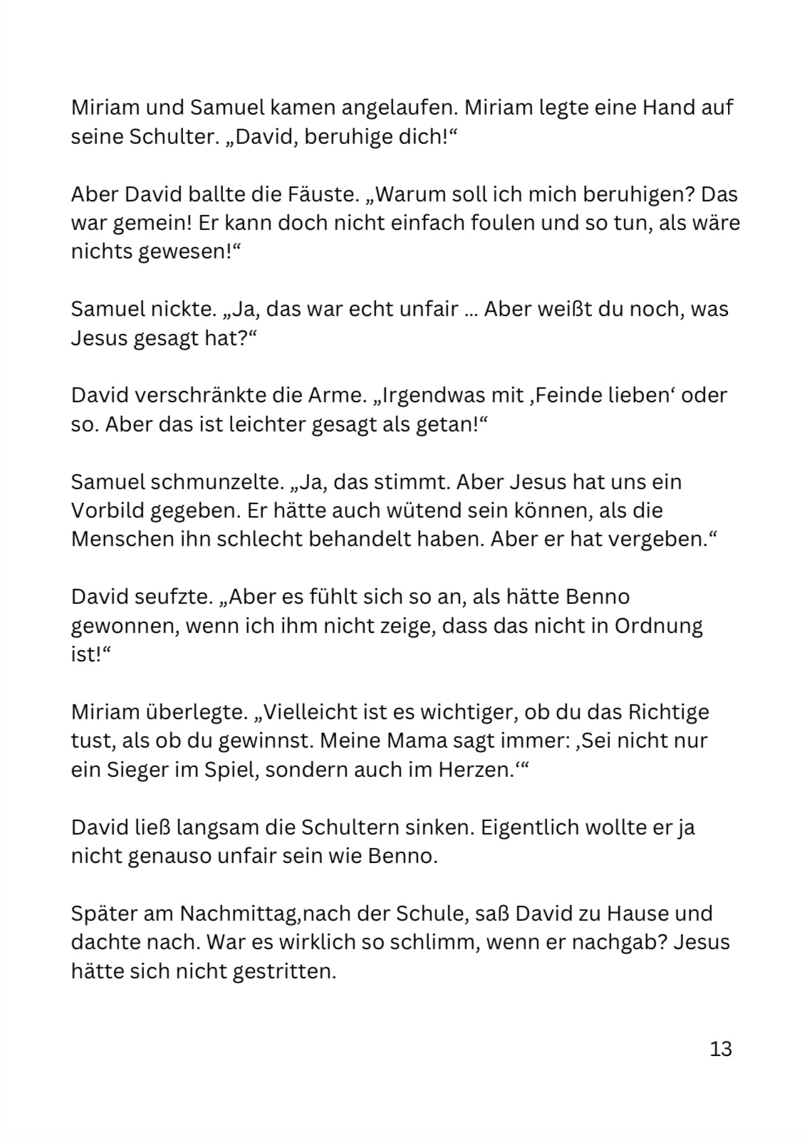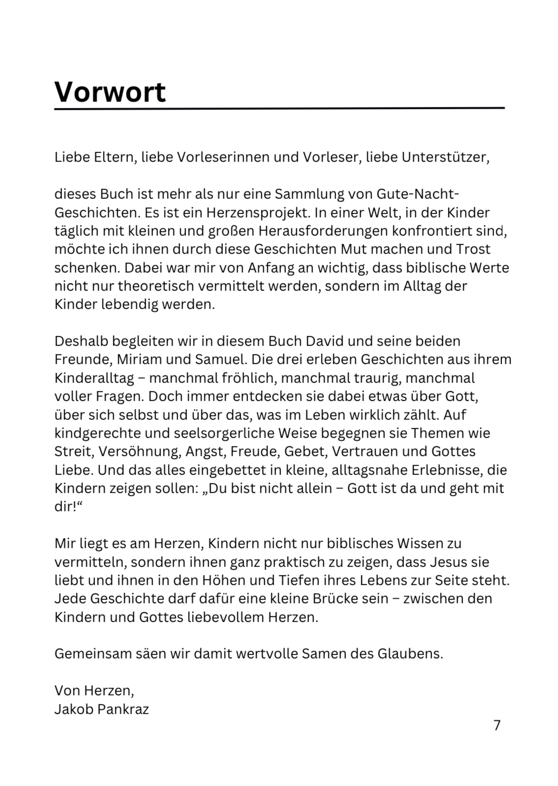 Die Geschichten sind kindgerecht erzählt, tiefgründig im Inhalt und voller Wärme, Trost und Hoffnung. Sie greifen Themen auf, die Kinder wirklich bewegen – von Streit und Angst bis hin zu Freundschaft, Mut und ersten Glaubensschritten. Jede Geschichte endet mit einem einfachen Fazit, das Kindern hilft, das Erlebte zu verstehen und auf ihr eigenes Leben anzuwenden.